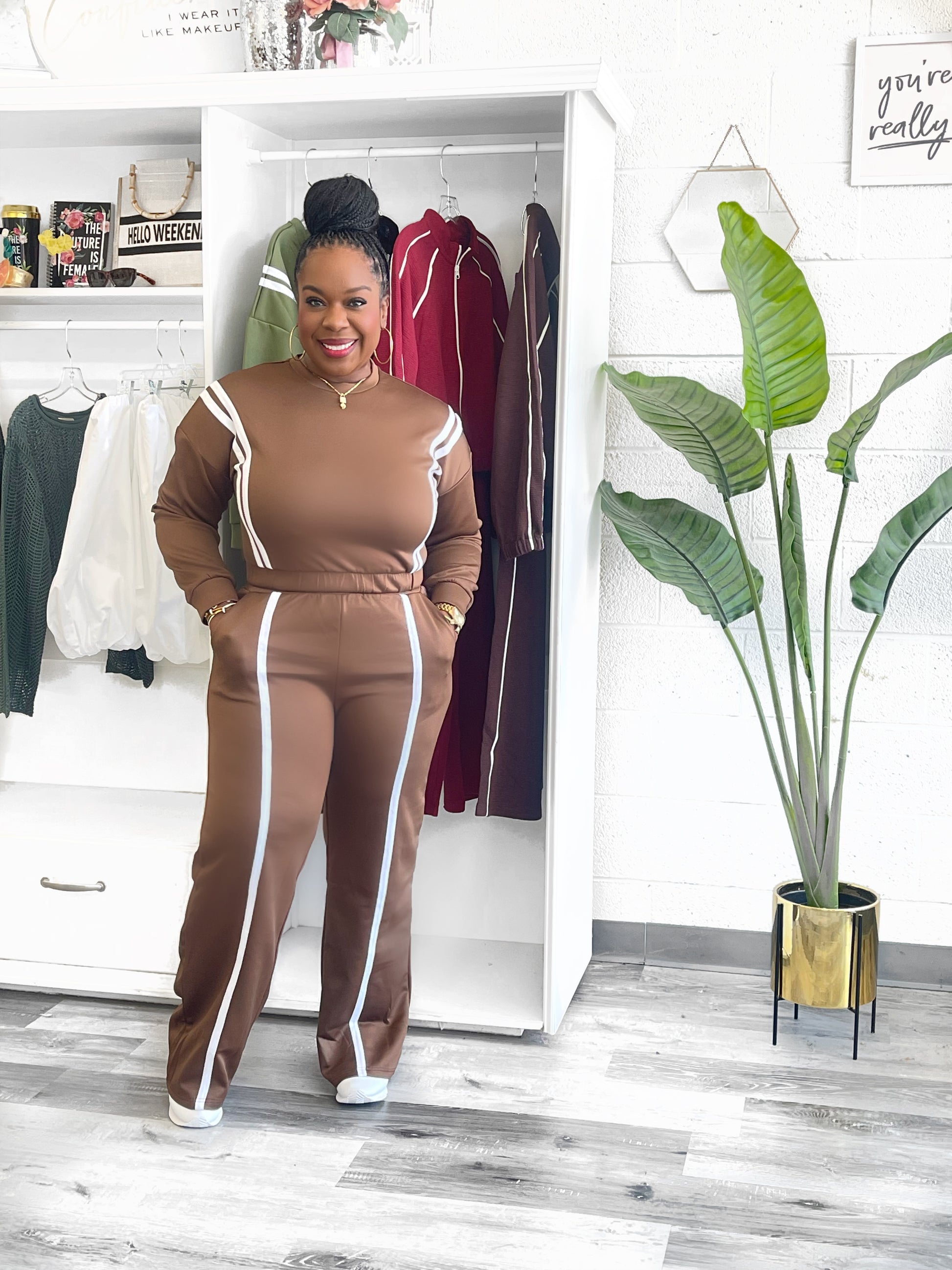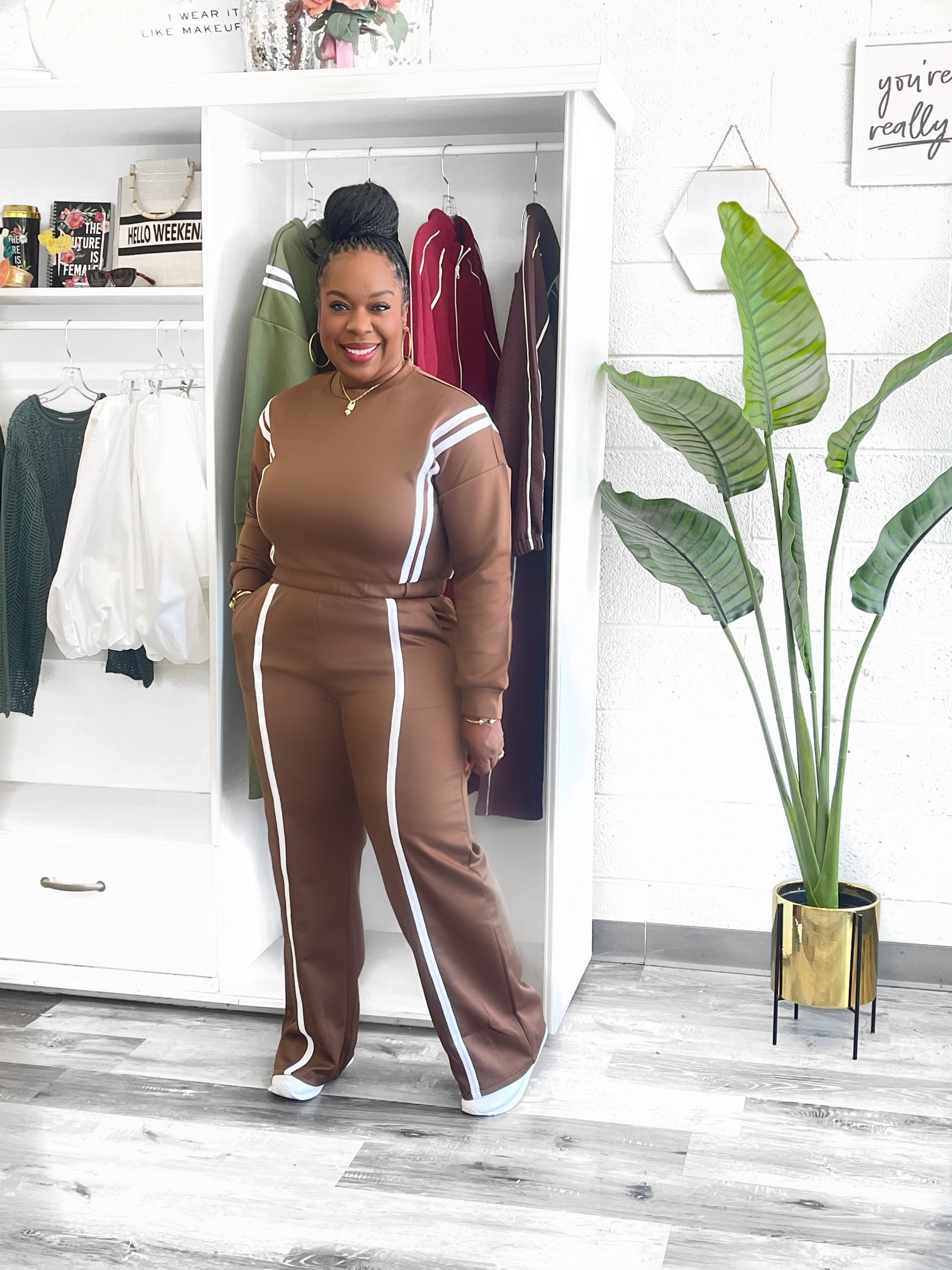 Dive into comfort with this playful Scuba two-piece set featuring a round neck long sleeve top with stripe tapping details and a stretchy elastic waistband for a perfect fit. She has POCKETS! The matching straight-leg pants offer side pockets and front stripe accents, combining style and ease.